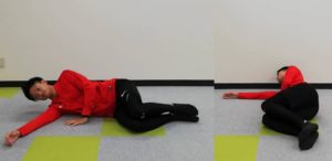 ①横向きになったまま膝を90°にたたみ、股関節も図のように曲げておきます。この時背筋は伸ばしてお腹に軽く力をいれておきましょう。