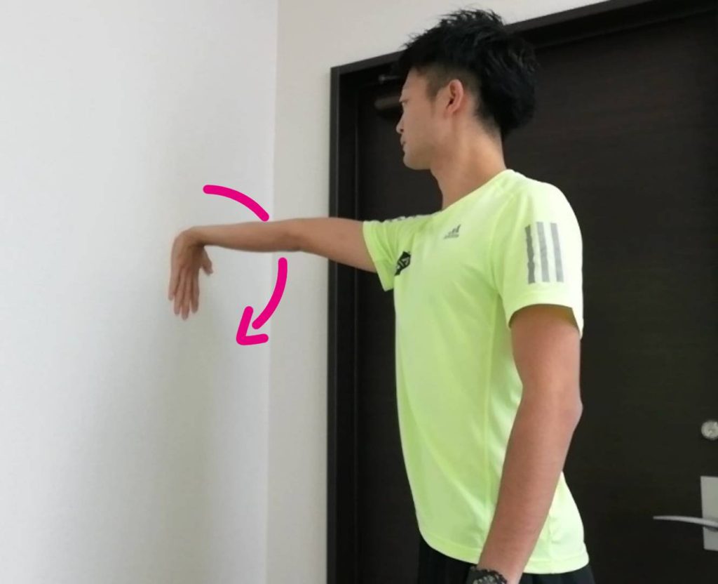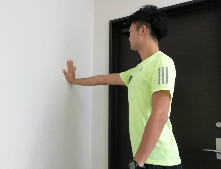 ①壁に向かって真正面に立ち、肩の高さに手をつきます。
