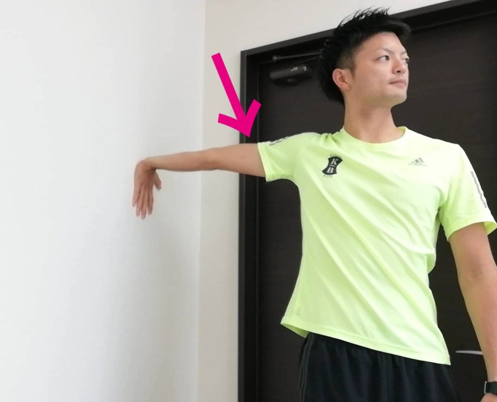 ③体開き、肩がすくまないように注意しながら二の腕の前面を伸ばしていきます。
