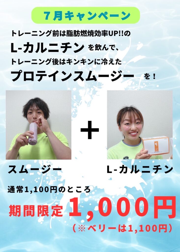 夏真っ只中となる7月のキャンペーンは、効率的な脂肪燃焼と、引き締まったカラダを手に入れるためのタンパク質+糖質補給のために、『L-カルニチン+プロテインスムージー』のセット販売をキャンペーンとさせていただきました!