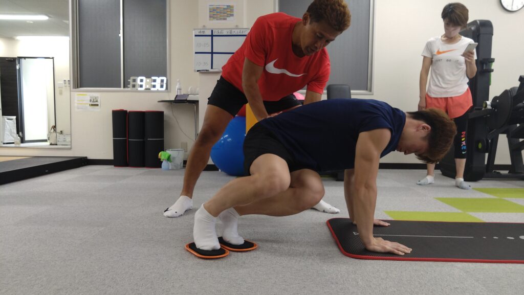 股関節&膝痛予防のクラスでは、プランク姿勢でのスライドボードレッグレイズがあります。