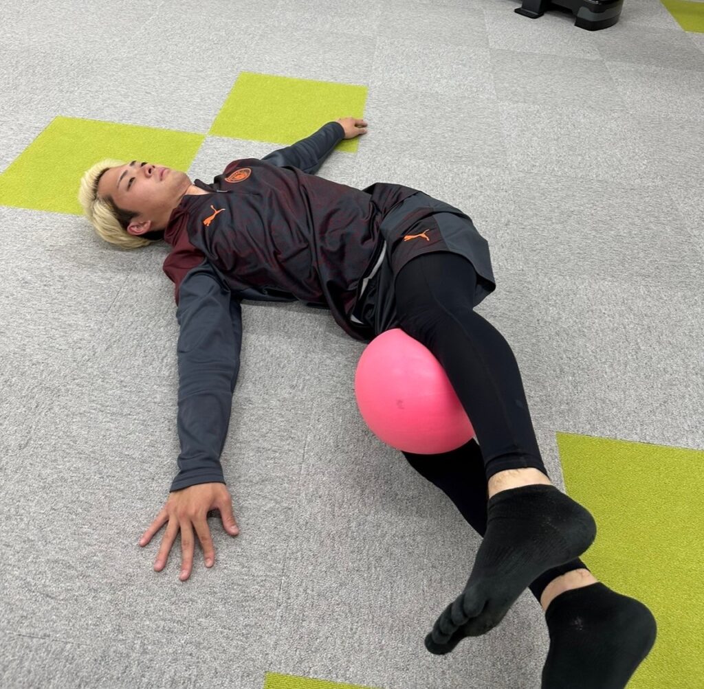 足だけを下ろすと、太ももの外側の力が強くなりますので、お腹の力が働いてるのを確認しながら動作を行いましょう。